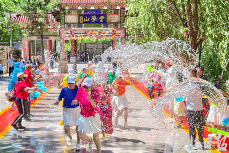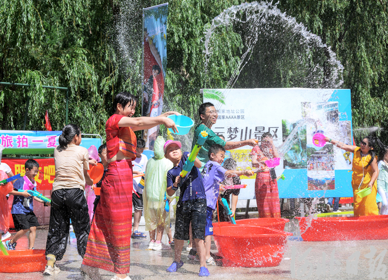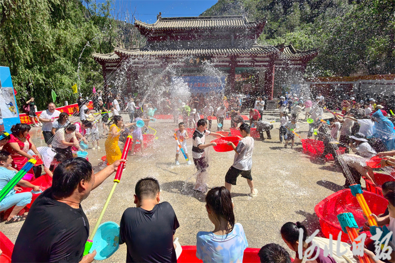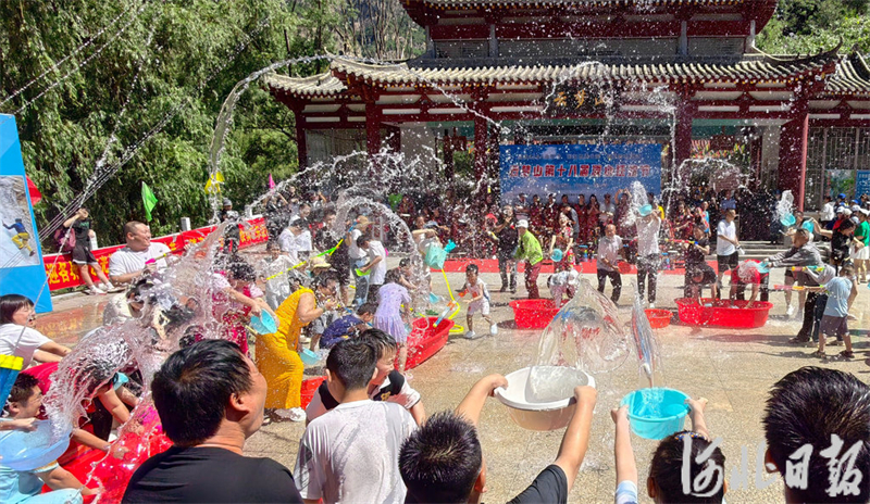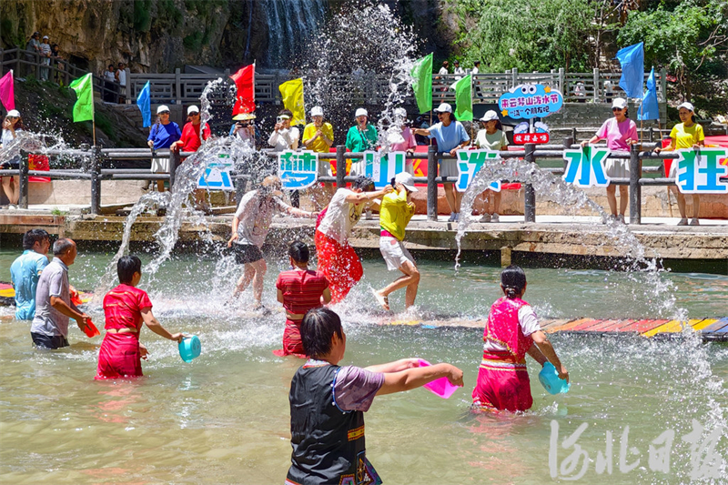 7月5日,游客在邢台市云梦山景区泼水消暑。
